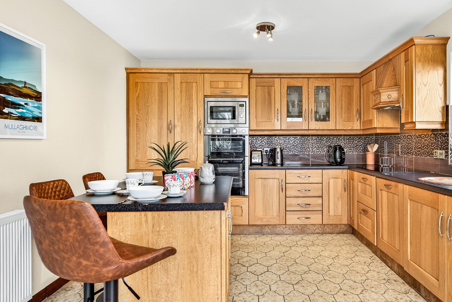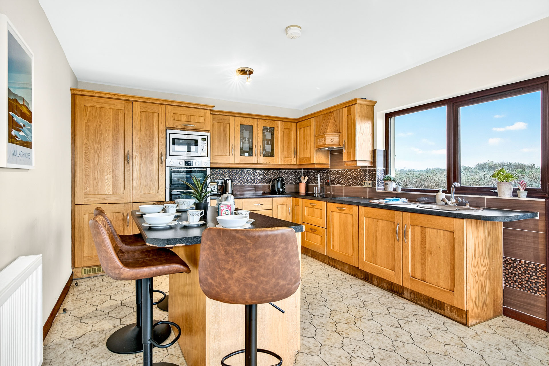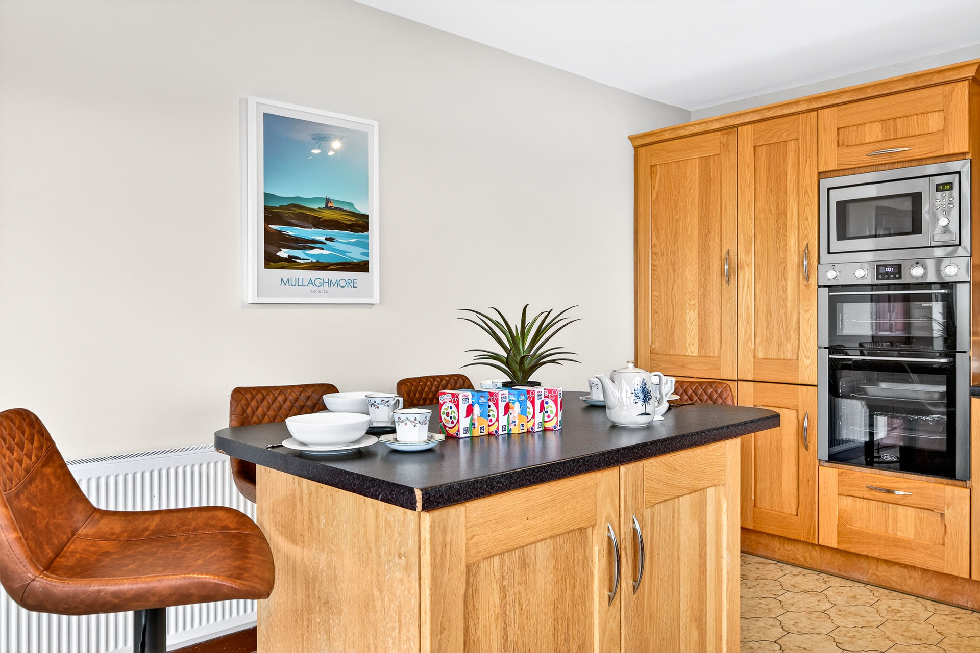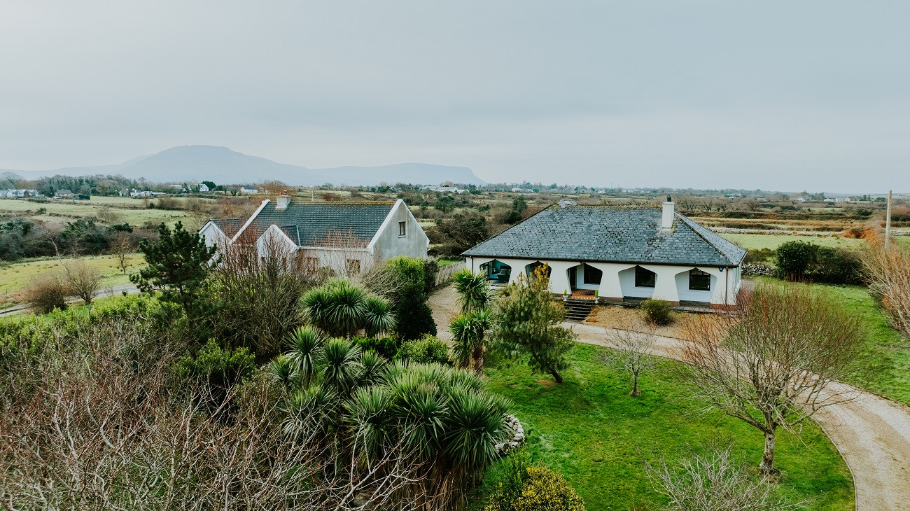 This beautiful house sits in the quiet countryside beside Mullaghmore. Catering for up to six people, it has two large king bedrooms, the largest of which has an ensuite with shower, and two single bedrooms. The main bathroom has both a shower and a bath. There is a very spacious living room with a wood burning stove and garden views which is in turn connected to a dining area with a large dining table. There is a fully equipped kitchen with double oven, electric hob, microwave, dishwasher, coffee machine and all the kitchenware, utensils and glassware necessary to cook a meal for a group of six.